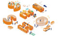 東京で起業する外国人やスタートアップ関係者向けに、茅場町周辺の支援拠点やレンタルオフィスの位置、最寄り駅などが分かるデジタルマップ用の俯瞰イラストを制作しました。