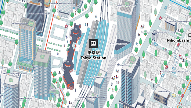 茅場町周辺のランドマークとなる建物も描き込み、街の特徴や位置関係が直感的に理解できるビジュアルに仕上げています。